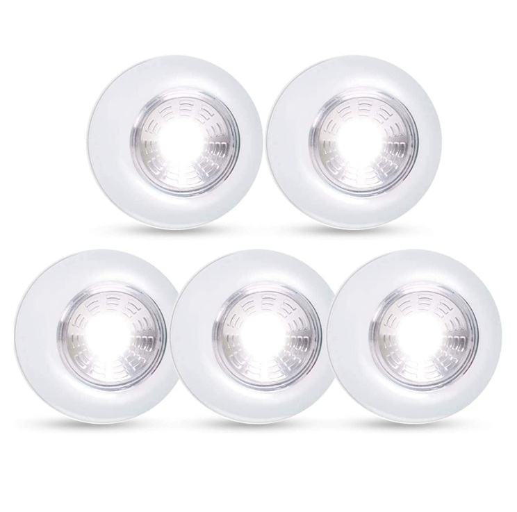 Item Detail: 5 pack of LED lights just push to turn on/off. Great for closet or under counter lighting. Stick On, Portable, Wireless, Kitchen & Closet Counter Night Lights, Cool White. Simple to install, uses 3 AAA Batteries.