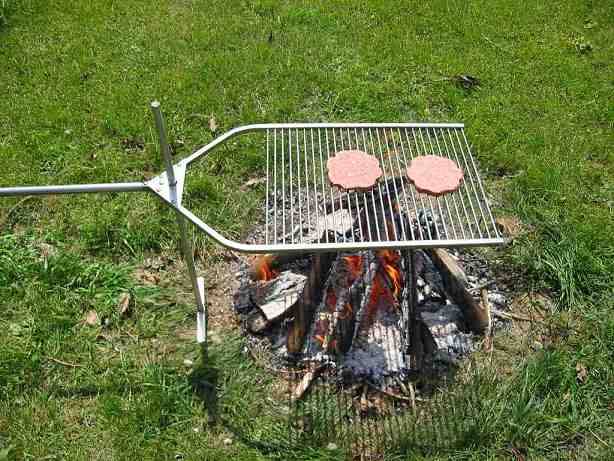Item Detail: Easy as 1, 2, 3! Push stake into dirt, place grill on stand and start grilling! Pivots 360 deg, adjustable height, stainless steel, 16" x 13" grilling area, carries weight of kettle or pot, removable handle for storage.