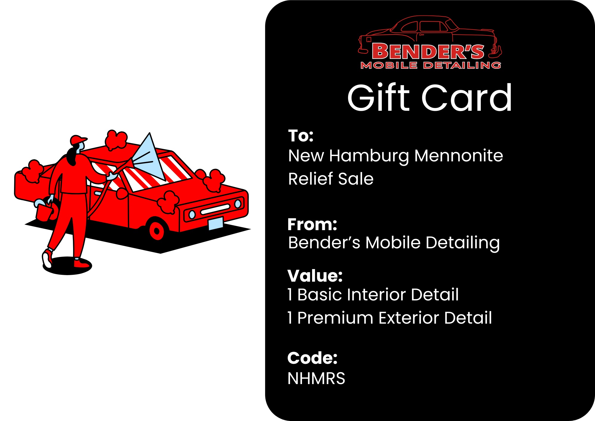 Item Detail: Make your vehicle look, smell, and feel brand new again! Gift card includes Basic Interior Detail plus Premium Exterior Detailing service. Bender’s Mobile Detailing will come to your home or place of employment and detail your car inside and out!