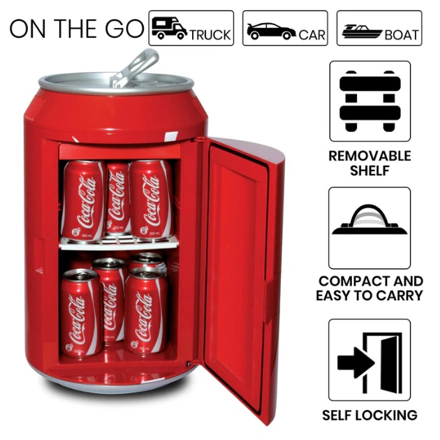 Item Detail: Refurbished unit Coca-Cola 10 Can Portable Mini Fridge w/ 12V DC and 110V AC Cords, 10L (10.6 qt) Can Shaped Personal Cooler, Red, Travel Fridge for Drinks, Snacks, Lunch, Home, Office, Dorm Room, RV.