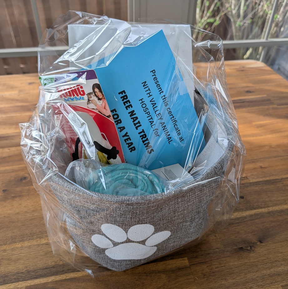 Item Detail: Pamper your cat with this amazing gift basket. Hills Prescription Diet Dental Care Cat Food 4lbs, Kong Catnip toy, Qty 2 x adjustable opening cat feeding toy, soft blanket & free nail trims for a year at Nith Valley Animal Hospital!