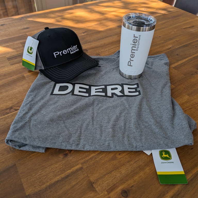 Item Detail: Premier Equipment/John Deere adjustable size hat, Large size Tee Shirt and Yeti 20oz (591ml) Rambler Tumbler in White.