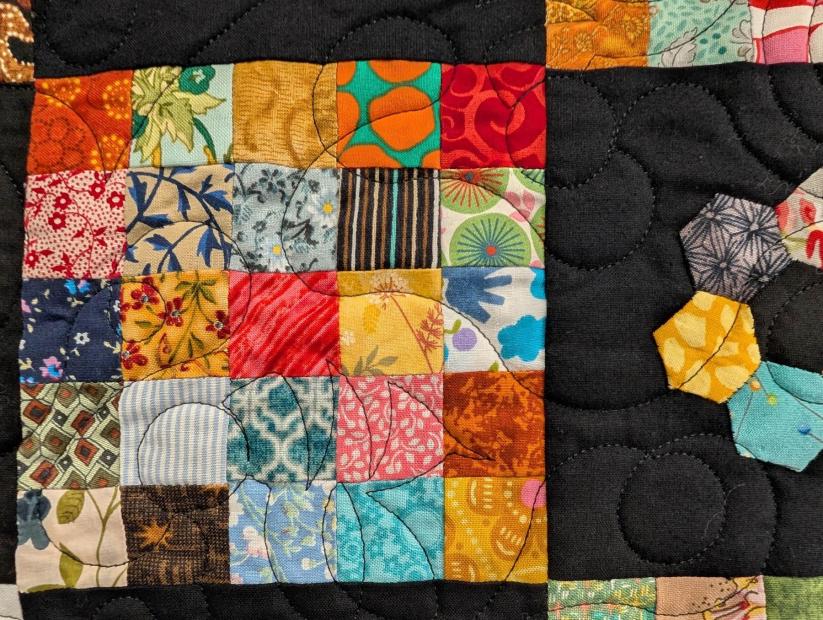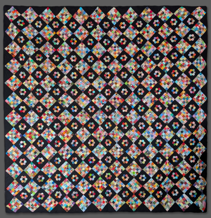 In true postage-stamp fashion, many blocks measure just one inch, with appliquéd and quilted hexagons even smaller. “I’m not a fast quilter; I don’t like to rush,” says Joyce. “A quilt will often take me years to make.”