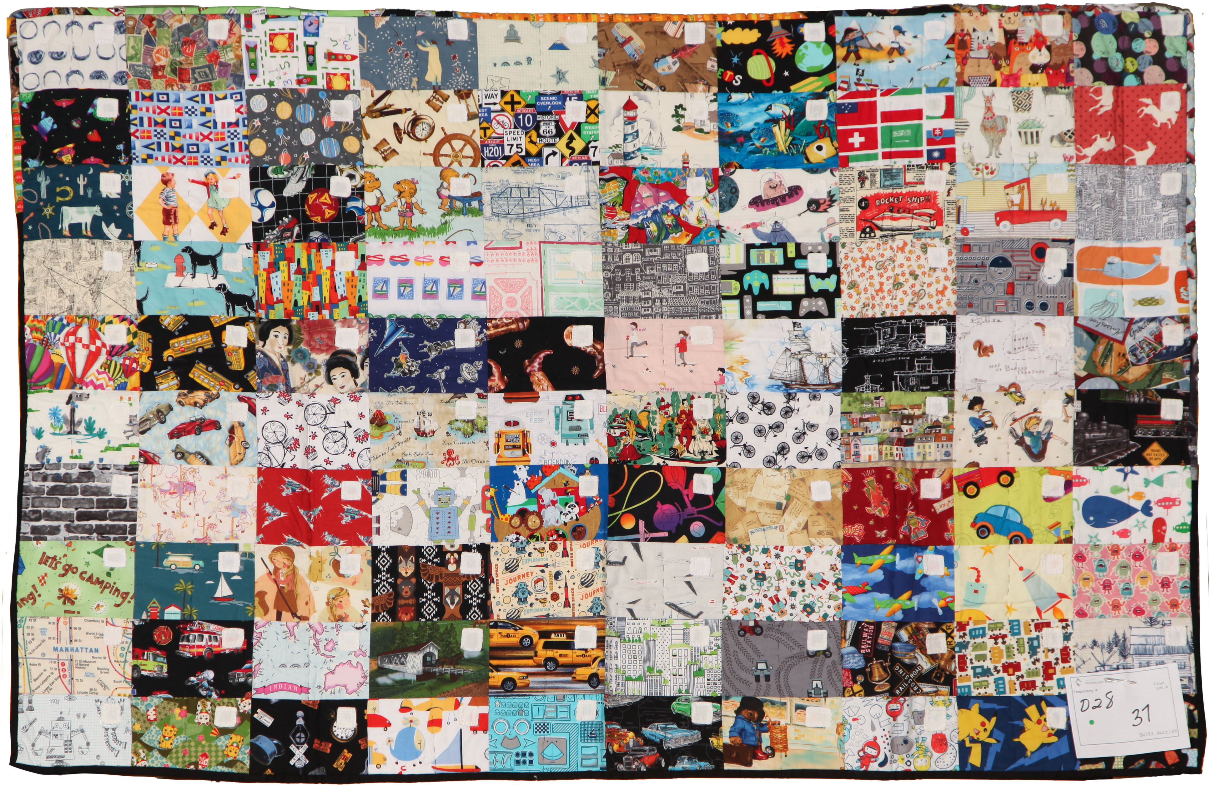 Whenever I travel I buy 3 things: postcards, Christmas ornaments & fabric. I've combined 2 of my 3 collections here. I can tell you where and who I got most of this fabric from years later. This doubles as a travel-themed eye-spy quilt!