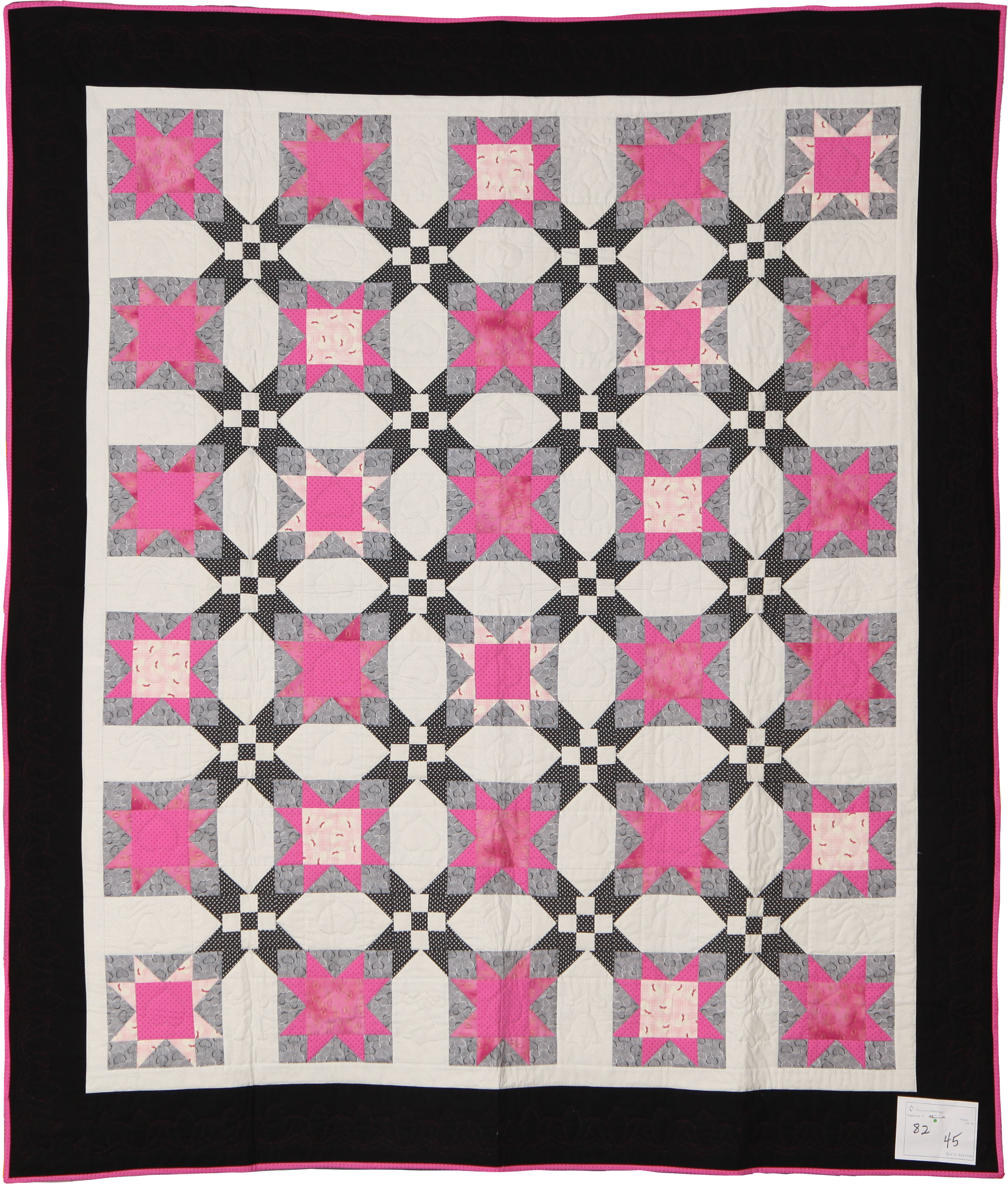 The striking contrast between light and dark coupled with the ever-popular colour fuchsia, really causes the stars to "pop" in this bright, cheerful quilt. It was the colours which attracted me to this design.