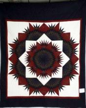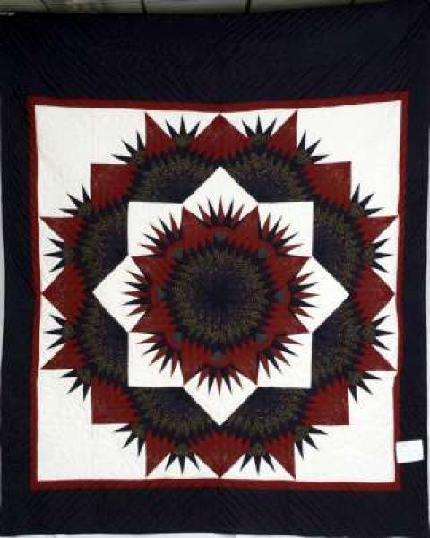 Catalogue Number: 118Sale Year: 2011Item Type: Bed QuiltColours: navyburgundycreamDonor(s): Florence Riehl, StratfordQuilter(s): Florence Riehl, StratfordMachine Quilted: noDimensions: 99 x 111Description: Pieced