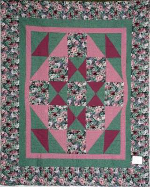 Catalogue Number: 153Sale Year: 2011Item Type: Bed QuiltColours: greenroseDonor(s): Ruth Zehr, New HamburgQuilter(s): New Hamburg Thrift Centre QuiltersMachine Quilted: noDimensions: 91 x 105Description: Pieced