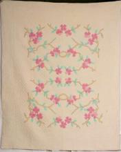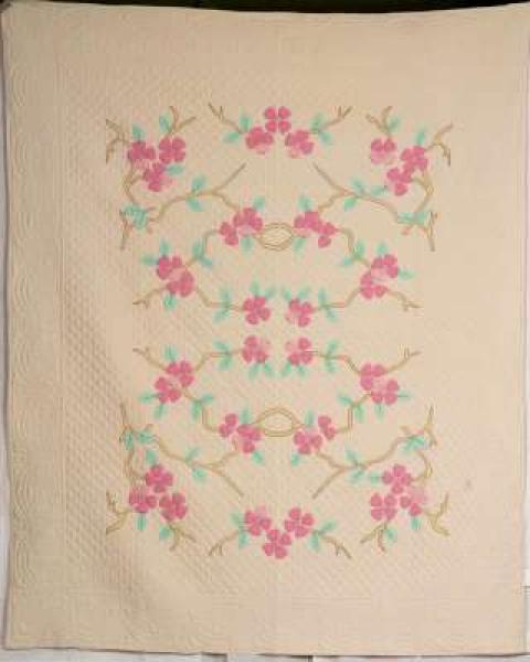Catalogue Number: 161Sale Year: 2011Item Type: Bed QuiltColours: creampinkgreenDonor(s): Helen Rempel, KitchenerQuilter(s): Helen Rempel, KitchenerMachine Quilted: noDimensions: 78 x 92Description: Appliqued