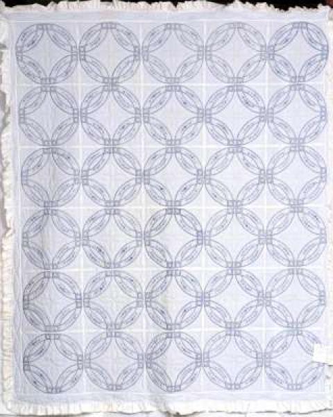 Catalogue Number: 180Sale Year: 2011Item Type: Bed QuiltColours: whiteblueDonor(s): Emma Huber, New HamburgQuilter(s): Emma Huber, New HamburgMachine Quilted: noDimensions: 84 x 97Description: Embroidered