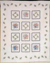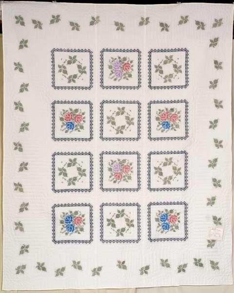 Catalogue Number: 011Sale Year: 2012Item Type: Bed QuiltColours: whitegreenblueDonor(s): Karen GingerichQuilter(s): Karen GingerichMachine Quilted: noDimensions: 90 x 98Description: Embroidered