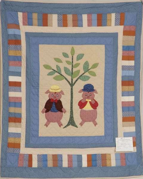 Catalogue Number: 046Sale Year: 2012Item Type: Crib QuiltColours: brownbluegreenDonor(s): Sandra Shantz, WellesleyQuilter(s): The Late Aleda StanburyMachine Quilted: noDimensions: 43 x 52Description: Apq&Pcd Late Aleda Stanbury