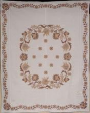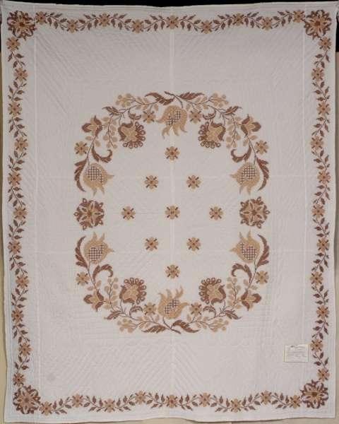 Catalogue Number: 061Sale Year: 2012Item Type: Bed QuiltColours: whitebrowngoldDonor(s): St. Jacobs WMCECQuilter(s): St. Jacobs WMCECMachine Quilted: noDimensions: 91 x 95Description: Embrdrd Hettie Brubacher
