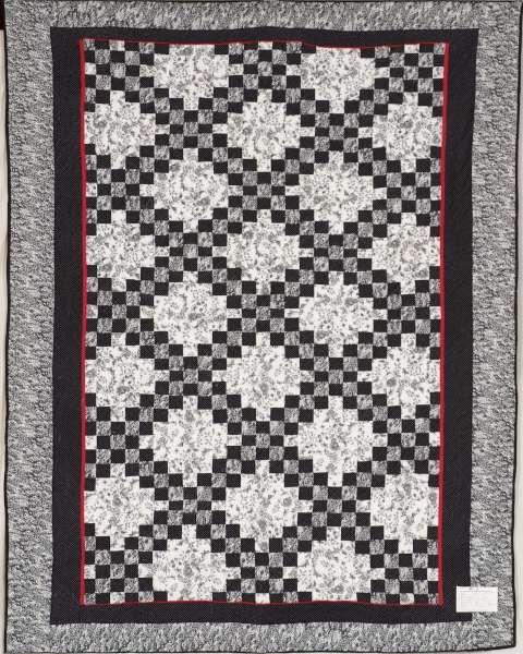 Catalogue Number: 062Sale Year: 2012Item Type: Bed QuiltColours: blackwhiteredDonor(s): Nancy Sabo & Elsie KuepferQuilter(s): Elsie Kuepfer, CambridgeMachine Quilted: noDimensions: 66 x 96Description: Pieced by Nancy Sabo