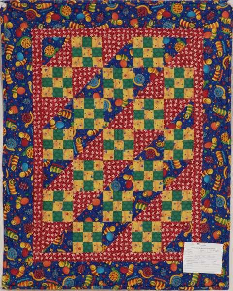 Catalogue Number: 103Sale Year: 2012Item Type: Crib QuiltColours: redblueyellowDonor(s): Sandra Shantz, WellesleyQuilter(s): First Mennonite WMCECMachine Quilted: noDimensions: 31 x 40Description: Pieced