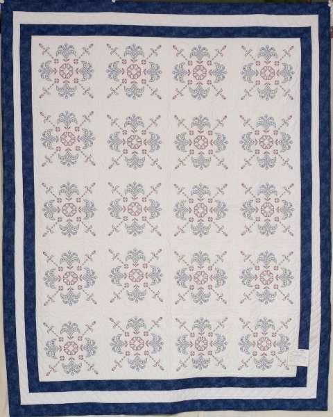 Catalogue Number: 112Sale Year: 2012Item Type: Bed QuiltColours: blueburgundywhiteDonor(s): Wilmot WMCECQuilter(s): Wilmot WMCECMachine Quilted: noDimensions: 85 x 102Description: Embrdrd Late Lillian Bowman