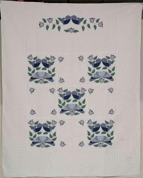 Catalogue Number: 146Sale Year: 2012Item Type: Bed QuiltColours: whitebluegreenDonor(s): St. Jacobs WMCECQuilter(s): St. Jacobs WMCECMachine Quilted: noDimensions: 90 x 103Description: Applq by Almeta Martin &