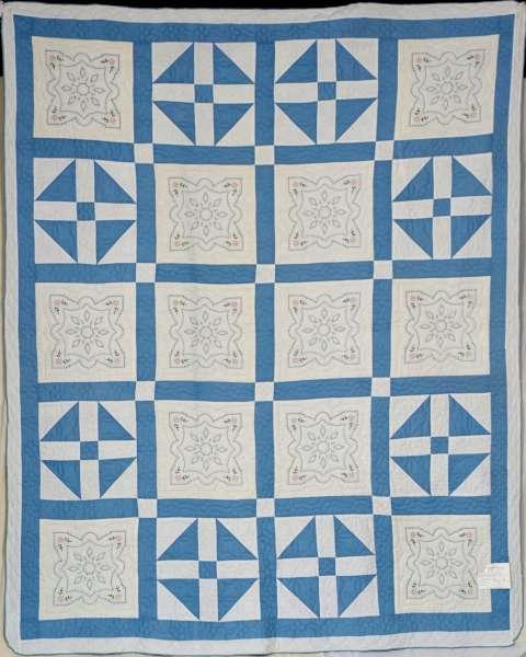 Catalogue Number: 161Sale Year: 2012Item Type: Bed QuiltColours: bluewhiteDonor(s): Betty M. Duerrstein, St. CatharinesQuilter(s): Betty & LouiseMachine Quilted: noDimensions: 90 x 108Description: Pieced & Embroidered