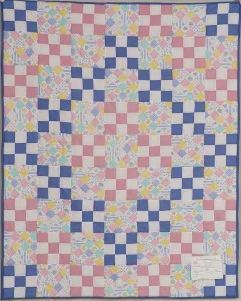 Catalogue Number: 192Sale Year: 2012Item Type: Crib QuiltColours: pinkbluewhiteDonor(s): Betty King, RodneyQuilter(s): Betty King, RodneyMachine Quilted: yesDimensions: 42 x 53Description: Pieced