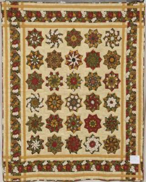 Catalogue Number: 021Sale Year: 2013Item Type: Bed QuiltColours: greenredgoldDonor(s): Carol HorstQuilter(s): Carol, Lena & Ada HorstMachine Quilted: noDimensions: 83 x 93Description: Pieced