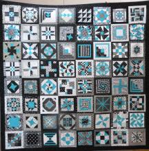 This group of quilters who meet once a month decided to buy one colour, teal, with black and white fabric from personal stashes. The quilt was sewn together at a quilt retreat. It was pieced in Winnipeg, MB.