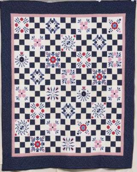 Catalogue Number: 095Sale Year: 2013Item Type: Bed QuiltColours: navyrosewhiteDonor(s): Arvilla BaechlerQuilter(s): Steinmann Menn & St Agatha WomenMachine Quilted: noDimensions: 89 x 100Description: Pieced with alt printed blocks