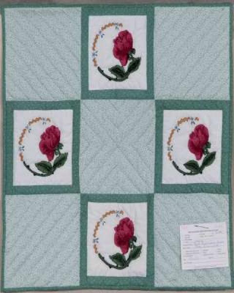Catalogue Number: 153Sale Year: 2013Item Type: Wall QuiltColours: rosegreenwhiteDonor(s): Florence BaumanQuilter(s): Florence BaumanMachine Quilted: noDimensions: 27 x 27Description: Pieced & Embroidered