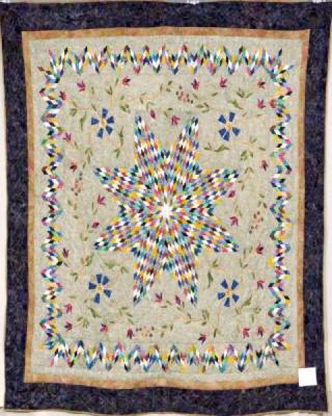 Most of the batik fabric was collected during trips in the US, as far as Skagway Alaska, Vancouver, Washington & Kentucky. The pattern was chosen while in Alaska but was pieced and quilted in Wellesley, ON.