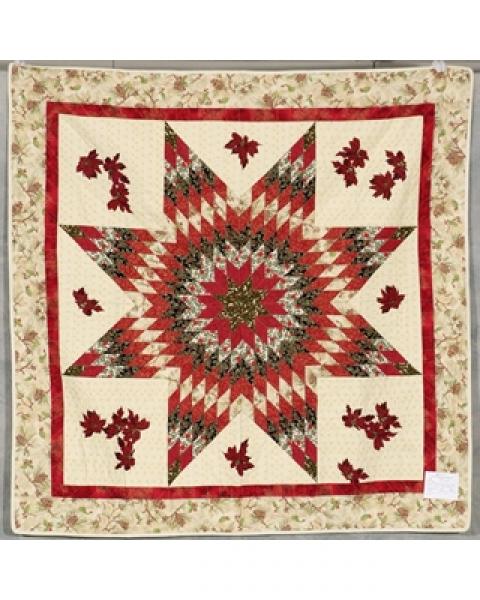 Catalogue Number: 020Sale Year: 2014Item Type: OtherColours: ivoryredgreenDonor(s): PJ Galinski, TorontoQuilter(s): PJ Galinski, TorontoMachine Quilted: yesDimensions: 74 x 74Description: Appliqued & PiecedThe Lone Star pattern made for a pretty Christmas quilt
