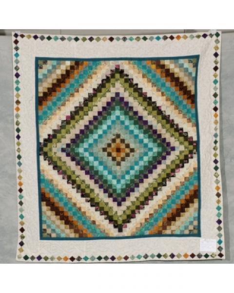 Catalogue Number: 044Sale Year: 2014Item Type: Bed QuiltColours: tealcreammultiDonor(s): Elizabeth RudyQuilter(s): Eastwood QuiltersMachine Quilted: noDimensions: 70 x 76Description: PiecedAn attempt to use up some of the stash collected for a couple of decades