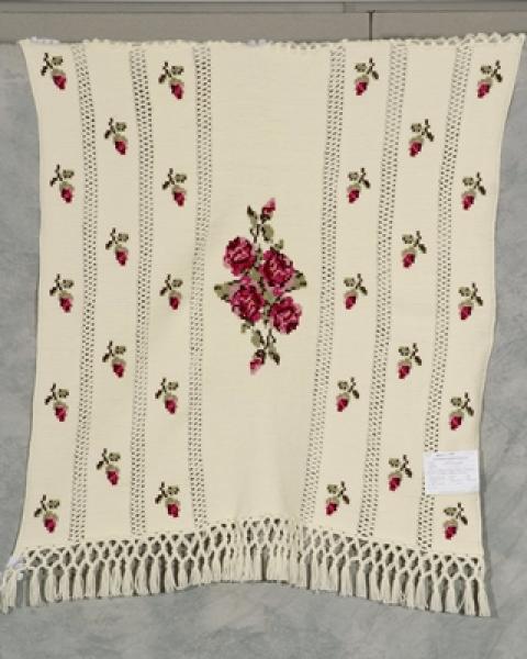 Catalogue Number: 049Sale Year: 2014Item Type: AfghanColours: creamrosegreenDonor(s): Wilma Good, WellesleyQuilter(s): Wilma Good, WellesleyMachine Quilted: noDimensions: 47 x 47Description: Crocheted