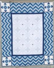 Being a caregiver sometimes leads to unexpected activity. My wife lost the use of her right side as a result of a stroke. In order to give her something to do and something she liked, I made a stand to hold the hoop so she could continue cross stitching blocks for quilt tops. Since I was there to thread her needle and change the hoop I was drawn into doing some myself. After doing some for grandchildren and two for charity our next one was for the MCC Relief Sale. She passed away before we got to it so I decided to take over. I developed an interest in designing borders for the tops and started piecing them myself. Here is my third quilt for this sale. Its my way of supporting the great work MCC is doing to ease the suffering in this world.