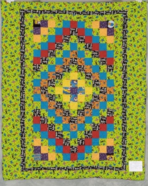 This quilt was made from the remnants of two quilts planned by my late sister, Doris Weber, Newton, KS (a faithful MCC worker) for her great grandchildren. When the second child was expected she planned a quilt for him. However she became ill with cancer and asked me to do the job. After I acquired the fabric I finished it after she passed away in October 2013. This present quilt is made from the remaining fabric from those two quilts, hoping someone still remembers and is still sentimental about the Beatles.
