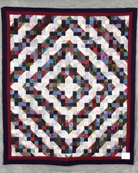 I saw this quilt (smaller to this one) at a quilt show in our church. I have made several like it as it uses up all kinds of scraps.
