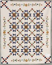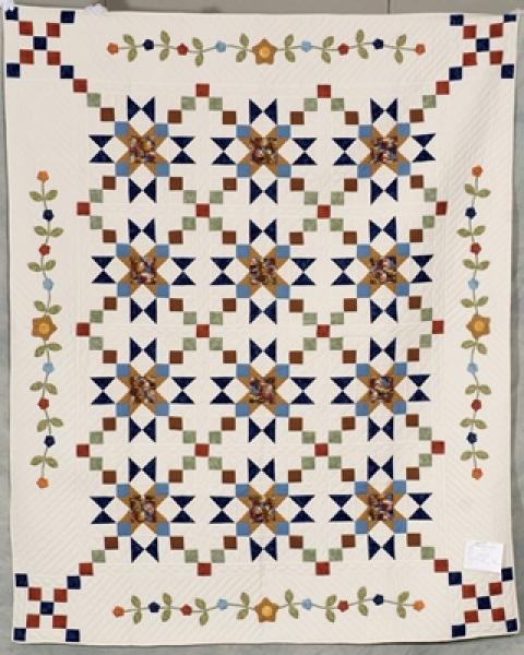 Catalogue Number: 100Sale Year: 2014Item Type: Bed QuiltColours: creammultiDonor(s): Poole WMCECQuilter(s): Poole WMCECMachine Quilted: noDimensions: 74 x 92Description: Appliqued & pieced
