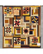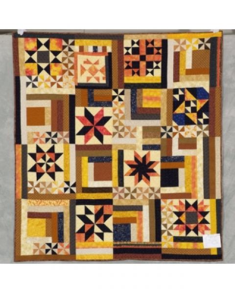 "Stars and Pinwheels" A collaborative effort by: Margaret Gilles who made and donated nine "star blocks" to the Four Corners Quilters' Guild, Mount Forest, ON; Creekbank Sewing Machine Shop who donated fabric; Pat Graham who assembled the top using the pattern "America Loves Scrap Quilts" Winter 2012/2013; Betty Henry who did the machine quilting and Margaret who finished the hand stitched binding. This quilt is being donated by the Four Corners Quilters' Guild in memory of Inga Jansen, a former Member, June 2013.
