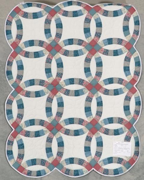 Catalogue Number: 110Sale Year: 2014Item Type: Crib QuiltColours: whitebluesalmonDonor(s): Elmira Montrose Markham MennoniteQuilter(s): Elmira Montrose Markham MennoniteMachine Quilted: noDimensions: 39 x 50Description: Pieced