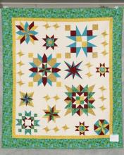 Catalogue Number: 115Sale Year: 2014Item Type: Bed QuiltColours: greencreammultiDonor(s): Anne Wickie & Beverly VanNinhuysQuilter(s): Anne Wickie & Beverly VanNinhuysMachine Quilted: yesDimensions: 74 x 86Description: Pieced