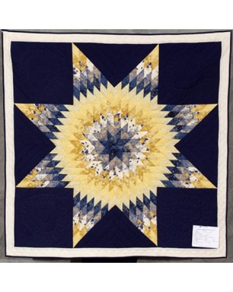 Catalogue Number: 128Sale Year: 2014Item Type: Wall QuiltColours: navyyellowcreamDonor(s): Fair Haven Markham MennoniteQuilter(s): Fair Haven Markham MennoniteMachine Quilted: noDimensions: 46 x 46Description: Pieced