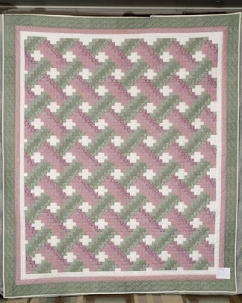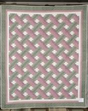Catalogue Number: 174Sale Year: 2014Item Type: Bed QuiltColours: greenrosecreamDonor(s): St. Agatha WMCECQuilter(s): St. Agatha WMCECMachine Quilted: noDimensions: 93 x 108Description: Pieced