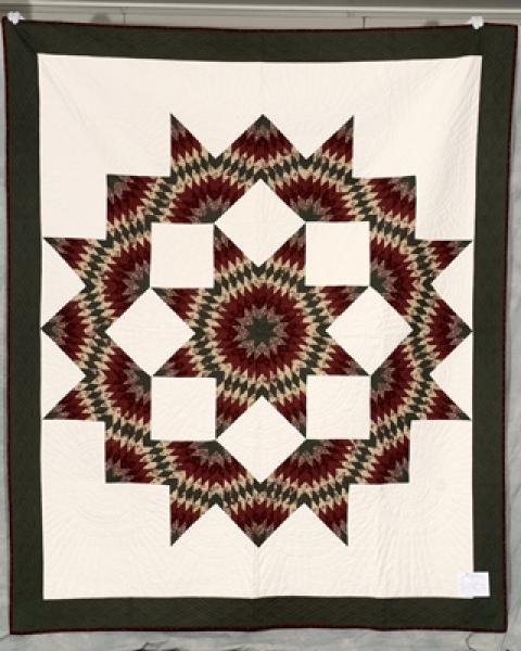 Catalogue Number: 190Sale Year: 2014Item Type: Bed QuiltColours: creamgreenburgundyDonor(s): Dianne StevanusQuilter(s): Bloomingdale WMCECMachine Quilted: noDimensions: 90 x 108Description: Pieced