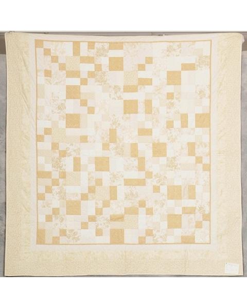 I had a lot of tan, cream and white fabric left over from other projects so I put them together in a scrappy pattern. Pattern uses one patch, two patch and four patch pieces. Completed about 2006. Please note that this quilt has equal borders on 3 sides only. I like to have more "pattern" over the pillow area.