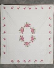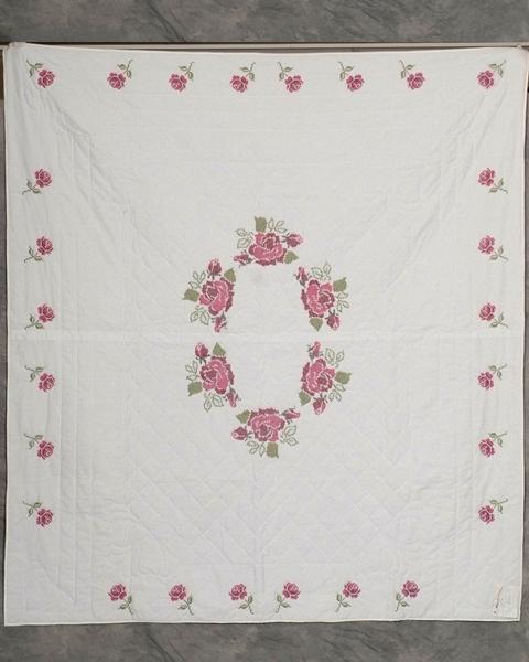 Catalogue Number: 012Sale Year: 2015Item Type: Bed Quilt includes pillow shamsColours: whitepinkgreenDonor(s): Myrtle Horst, KitchenerQuilter(s): St. Jacobs Mennonite WMCECMachine Quilted: noDimensions: 90 x 99Description: Embroidered by Myrtle Horst