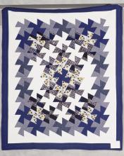 Catalogue Number: 073Sale Year: 2015Item Type: Bed QuiltColours: navywhiteDonor(s): Ardith Frey, WaterlooQuilter(s): Ardith Frey, WaterlooMachine Quilted: noDimensions: 71 x 85Description: PiecedThe printed fabrics were purchased on trips to Zimbabwe, Kenya and Ghana.
