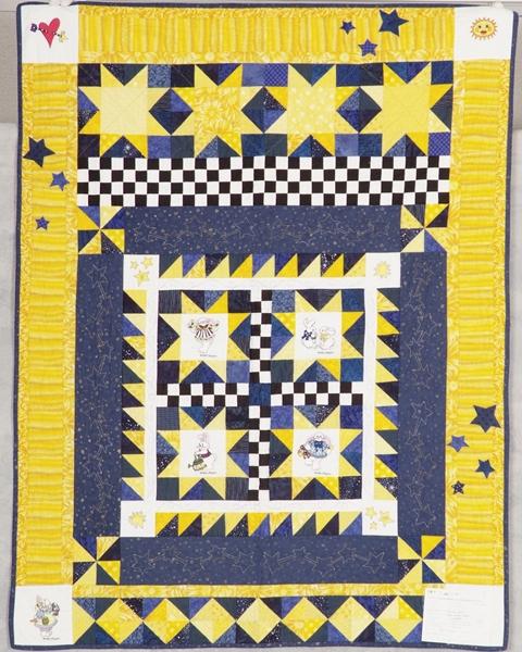 Using left over blocks from the original pattern called "Daddy Who Hung the Moon" and incorporating machine embroidered bunnies from an embroidery disk called "Bears & Bunnies" by Daisy Kingdom, this quilt was designed by me. I loved the original combination of the yellows, blues and white & black checker board.
