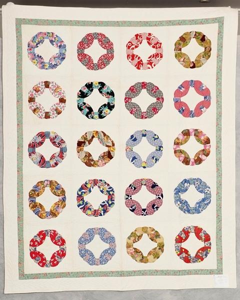 Catalogue Number: 127Sale Year: 2015Item Type: Bed QuiltColours: creammultiDonor(s): Hawkesville WMCECQuilter(s): Lorna MartinMachine Quilted: noDimensions: 79 x 96Description: Appliqued & pieced