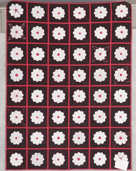 When a donation of white cotton hearts was given to the guild, members were asked to create flower blocks on black with red accents. The blocks were joined using the quilt-as-you-go method and this is the result. We choose to support MCC through this donation.