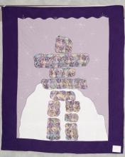 The creators of this quilt were Margaret Shilton and Eva Diller. Margaret had been given a piece of batik from her sister-in-law. It had Inuit figures which inspired the two to think of an inuksuk. Margaret designed the quilt and Eva contributed to that design with the snow and border material. Quilted by Wideman Mennonite Sewing Circle, Markham, ON. I purchased it at the Black Creek Pioneer Village Relief Sale in September 2014, not intentionally. It has never been used!! I would like to donate to benefit the good work MCC does.