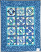 Catalogue Number: 151Sale Year: 2015Item Type: Bed QuiltColours: purpleaquaDonor(s): Sandra-Jean Mallough, StratfordQuilter(s): Retail Dry Goods GlammisMachine Quilted: noDimensions: 72 x 90Description: Pieced